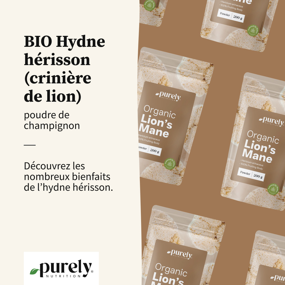 Ingrédients : hydne hérisson (Hericium erinaceus) en poudre de culture biologique certifiée. Distribution contrôlée par SI-EKO-002. Agriculture hors UE.