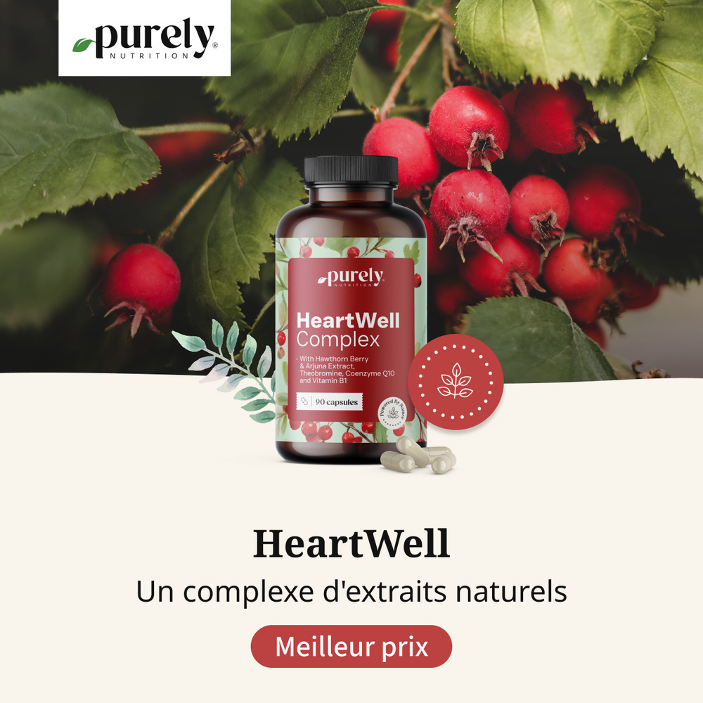 Ingrédients : extrait d'aubépine 4:1, extrait d'arjuna 10:1, hydroxypropylméthylcellulose (HPMC ; enveloppe de la gélule végétale), stéarate de magnésium (anti-agglomérant), extrait de cacao (24 % de théobromine), coenzyme Q10, thiamine (vitamine B1).
