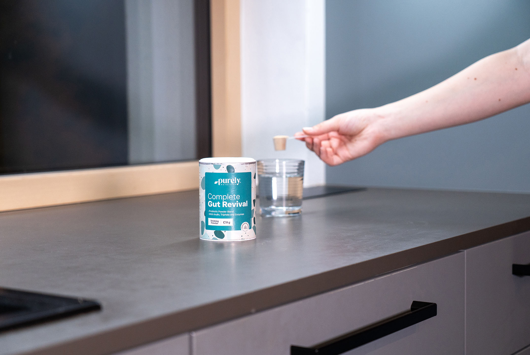 Ingrédients: dattes en poudre (Phoenix dactylifera L.), inuline, L-glutamine, kiwi en poudre (Actinidia deliciosa), arôme naturel, agent anti-agglomérant: extrait sec de bambou (Bambusa bambos L .; jeunes pousses; 85% d'oxyde de silicium), extrait sec de guimauve (Malva sylvestris L.), mélange d'enzymes (à partir de substrats végétaux fermentés; alpha-amylase, protéase, lactase (bêta-D-galactosidase) lipase, cellulase), N-acétyl-glucosamine, extrait sec de mélange triphala (Emblica officinalis, Terminalia bellerica, Terminalia chebula; 1: 1: 1; fruits), arabinogalactane, citrate de zinc, ascorbate de sodium (vitamine C), stévia (98% de rébaudioside).
